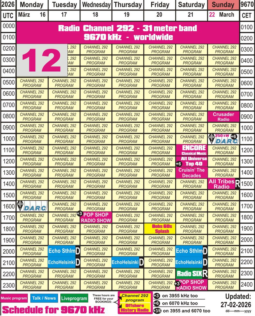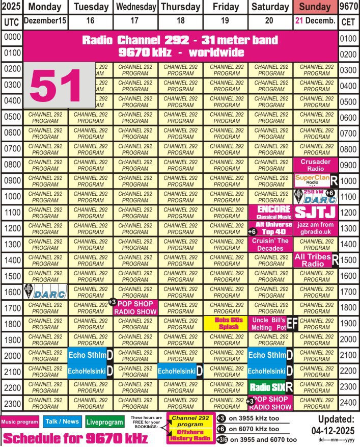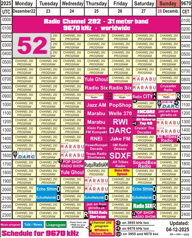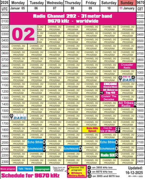 Directions of our beam for 9670 kHz. The letters A - S in the schedule show the target area of the program.